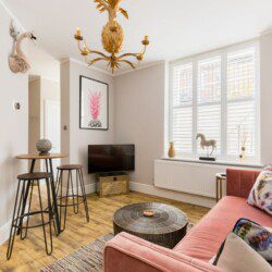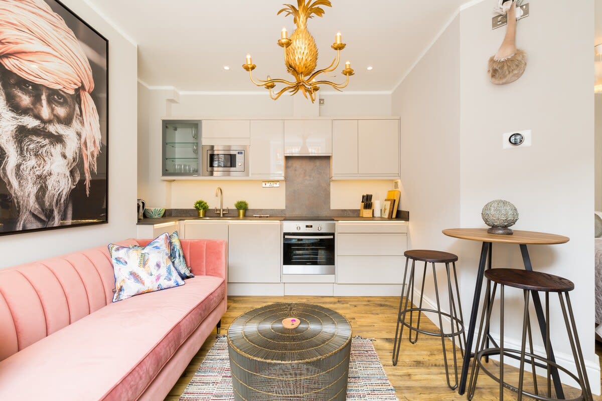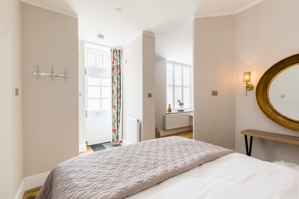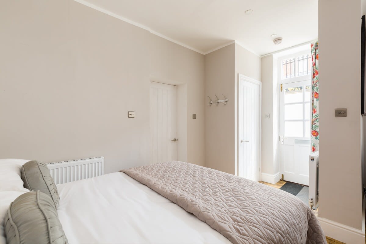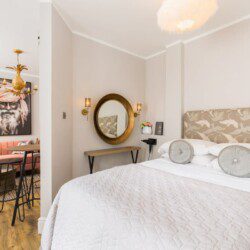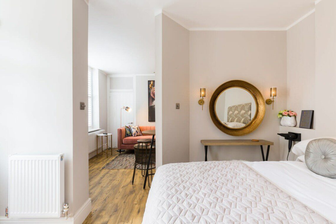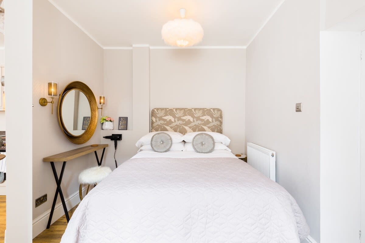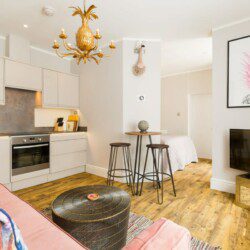 This stunning studio apartment is located on the lower ground floor level and has a private entrance and patio. Although classed as a studio, it is roomy and has a separate single bedroom and a further sleeping area with a double bed, just off the living/kitchen area. The studio can sleep up to three guests in the double bed and single bed. This accommodation is ideally suited to a single business travellers or a small family / group of 3 friends.
